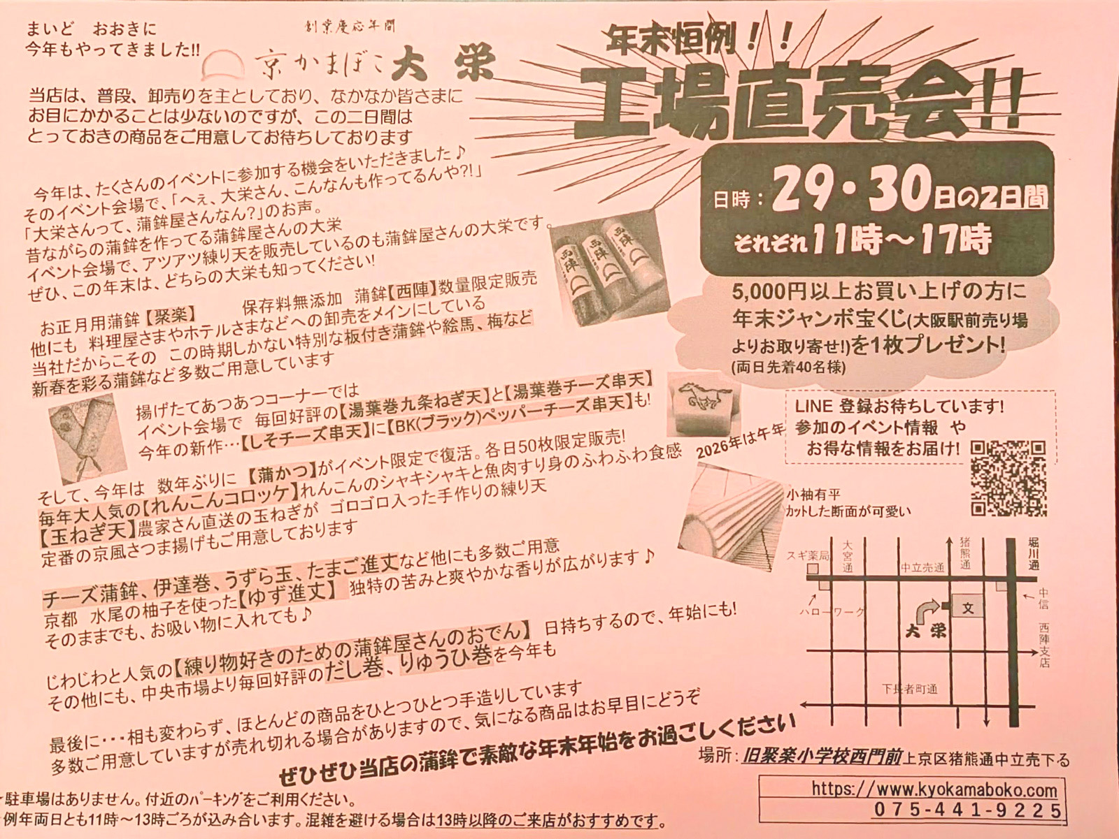今年も恒例の工場直売会を行います。5,000円以上お買い上げの方に、年末ジャンボ宝くじを1枚プレゼントします!(両日先着40名様)